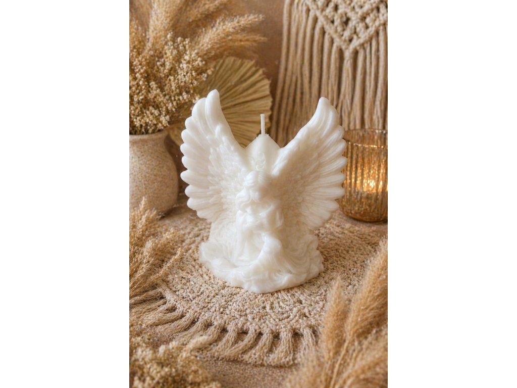 Rozpjatá křídla z perleťově bílého vosku jsou vyřezána do posledního pírka — jako by se právě chystal vzlétnout a vzít tě s sebou. Jeho tělo ovinuté vlnami světla skrývá tvář, která se usmívá jen těm, kdo věří. Perleťový lesk mění svou podobu s každým pohybem — v jednu chvíli tichý a měkký, v druhou oslnivě zářivý.