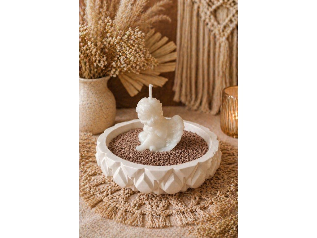 Malý andělíček z čistě bílého vosku pokojně odpočívá v náručí jemného sypkého vosku, jako by se právě snesl z oblak a usadil se v tichém zátiší. Obklopuje ho elegantní miska s reliéfem připomínajícím rozkvétající květ — bílá, čistá, klidná.