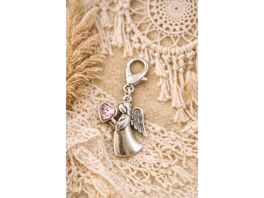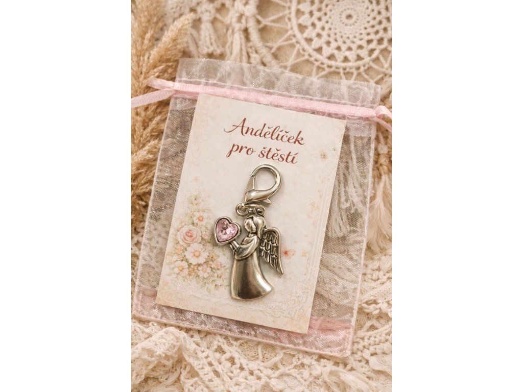 Jemný andělíček s růžovým srdíčkem je symbolem lásky, ochrany a štěstí. Něžné zpracování anděla s křídly a třpytivým srdcem v jemně růžovém tónu z něj dělá krásný drobný talisman, který zahřeje u srdce a připomene, že na nás někdo myslí.