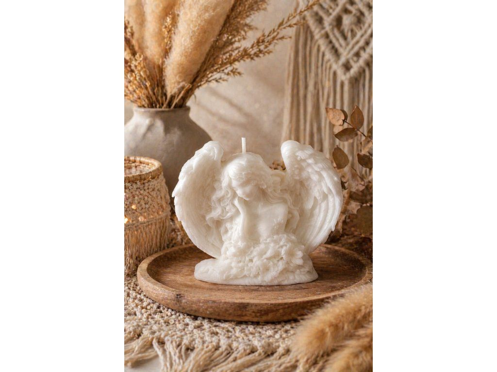 Bílý perleťový vosk mění světlo jinak než cokoli jiného. Ve dne září chladnou, téměř mramorovou krásou. V noci, při zapáleném knotu, se po jejích křídlech rozlévají zlatavé stíny a celá postava ožívá – jako by dýchala.