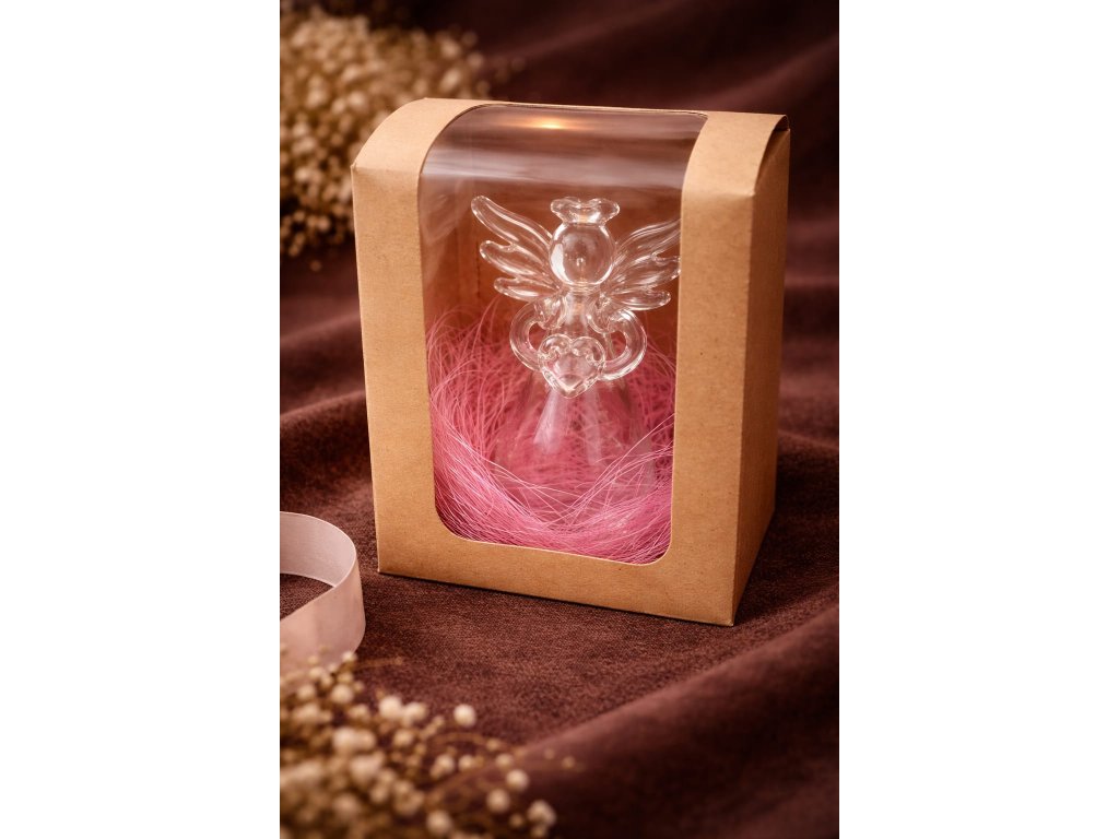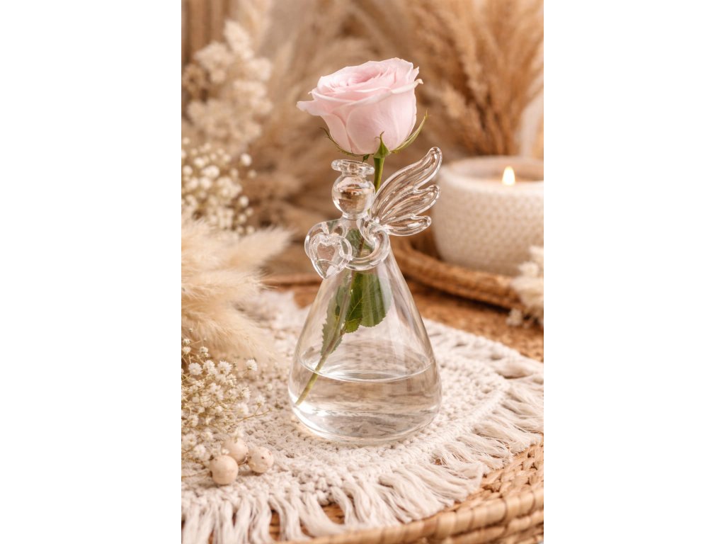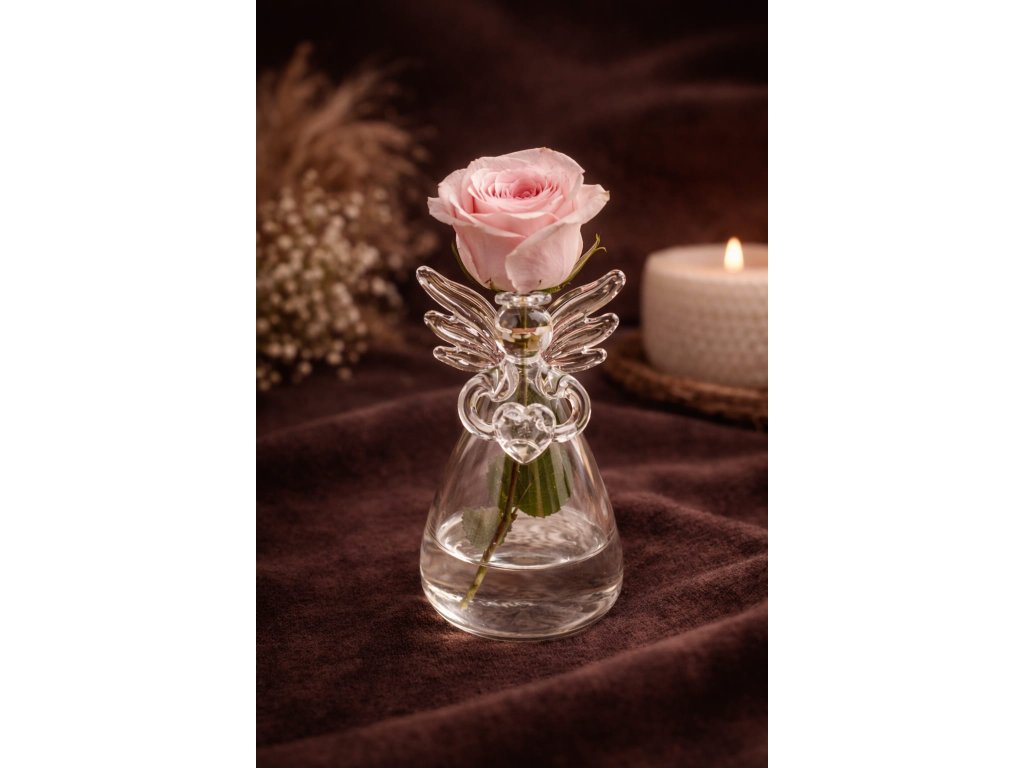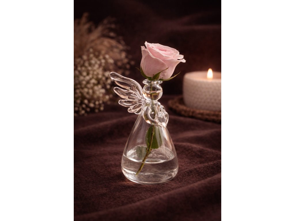 Něžná skleněná váza ve tvaru anděla vnese do domova klid, jemnost a pocit ochrany. Průzračné sklo je precizně tvarované do podoby anděla s roztaženými křídly a srdcem, které symbolizuje lásku a harmonii. Díky svému elegantnímu provedení působí váza lehce a vzdušně.