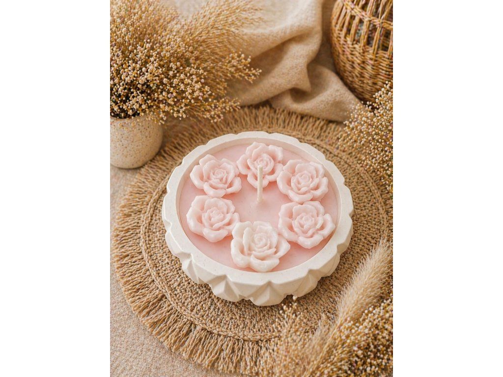 Jemně růžové růže z vosku, ručně vytvarované do kruhu – jako věnec položený andělskýma rukama. Spočívají na hladině růžového vosku v bílé reliéfní misce, klidně a vyváženě. Jako by čekaly, až je někdo probudí plamenem.
