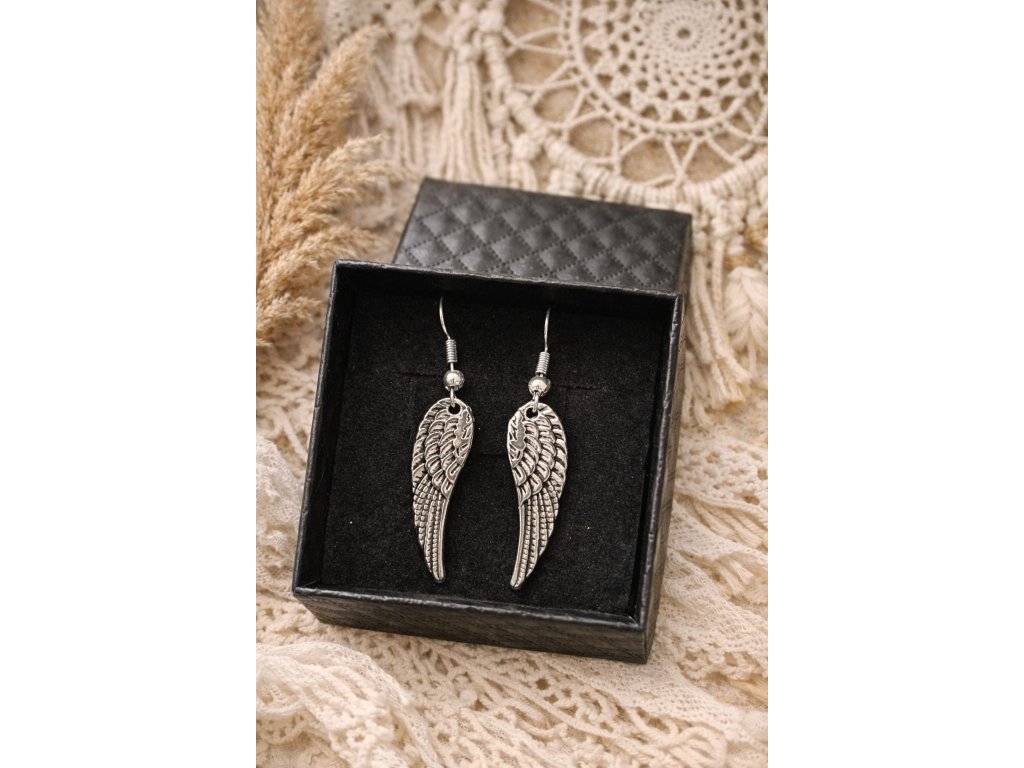 Elegantní náušnice ve tvaru andělských křídel jsou symbolem ochrany, lehkosti a vnitřní síly. Detailně propracovaná křídla s jemnou patinou dodávají šperku vintage nádech.