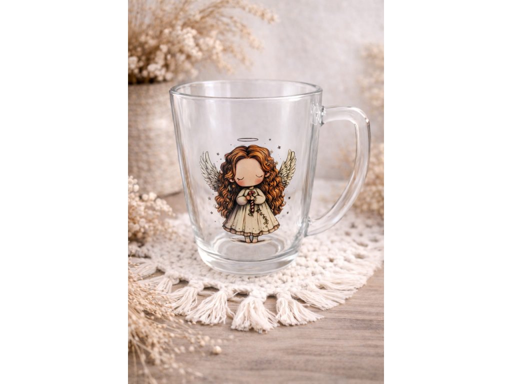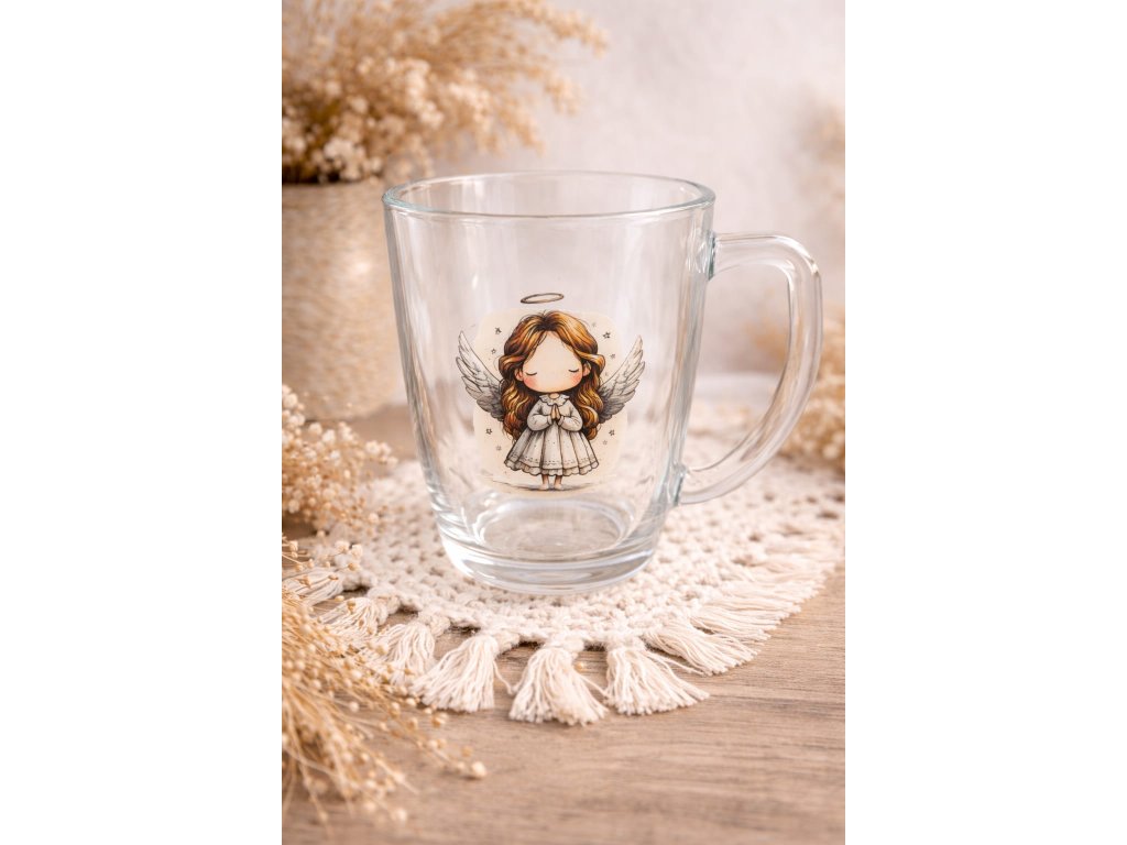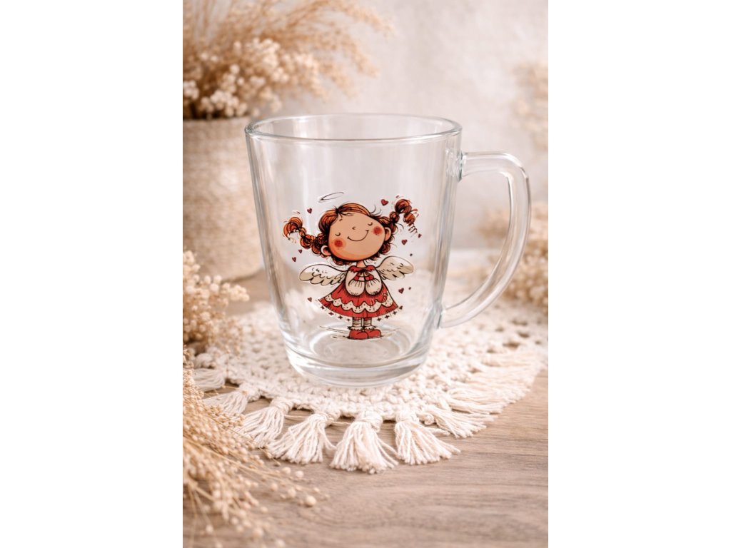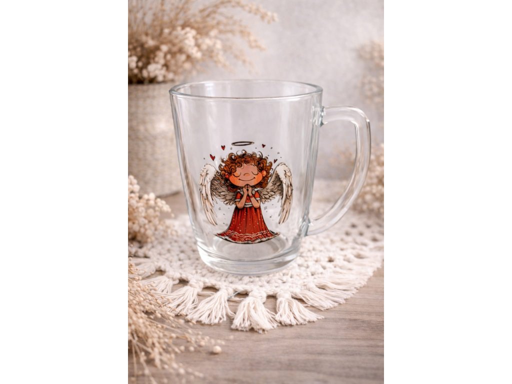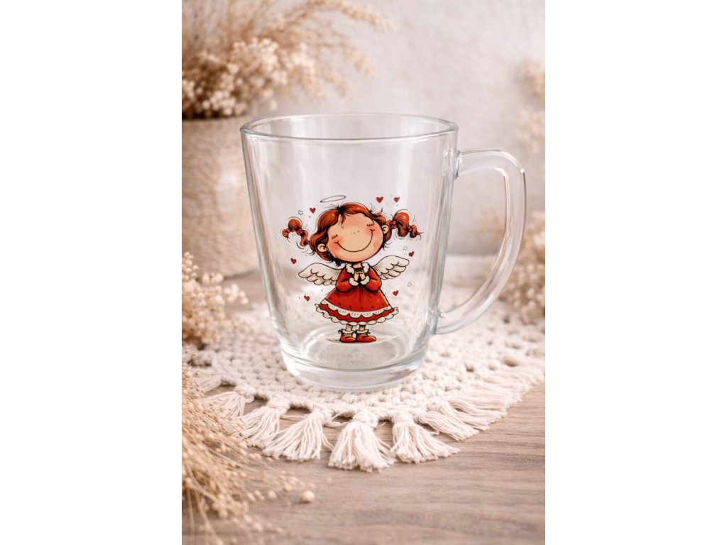 Kouzelný skleněný hrníček s roztomilým andělíčkem přináší do každého doušku pocit klidu, radosti a jemné ochrany. Průhledné sklo krásně vynikne s něžnou ilustrací anděla v teplých tónech červené a béžové, která působí hravě a zároveň uklidňujícím dojmem.