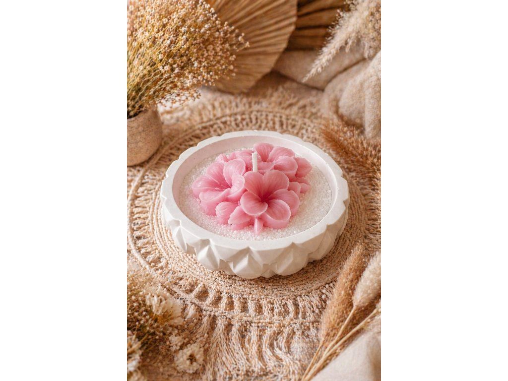 Něha zachycená ve vosku. Růžový květ ručně vytvarovaný do posledního lístku, spočívající v jemném perleťovém sypkém vosku jako v oblaku. Bílá miska s reliéfním vzorem, která sama o sobě je malým uměleckým dílem.