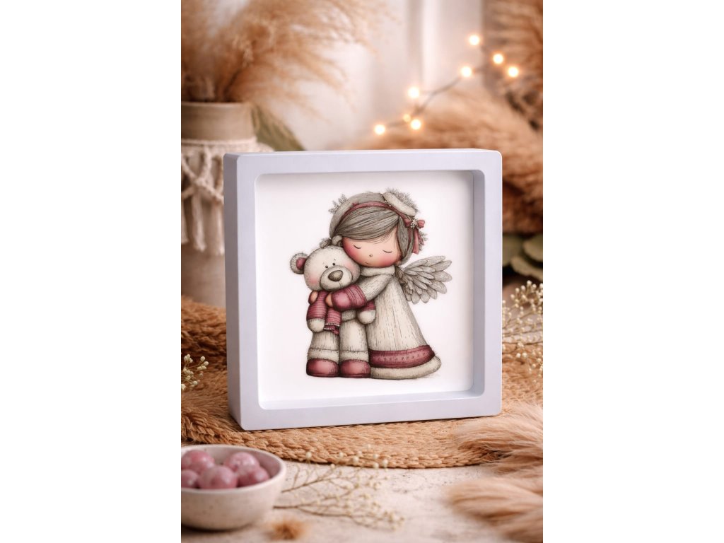 V bílém minimalistickém rámečku je zasazen roztomilý motiv andělíčka, který s láskou objímá malého medvídka. Celý obrázek působí velmi něžně díky pastelovým tónům, jemným detailům a uklidňujícímu výrazu postavičky.