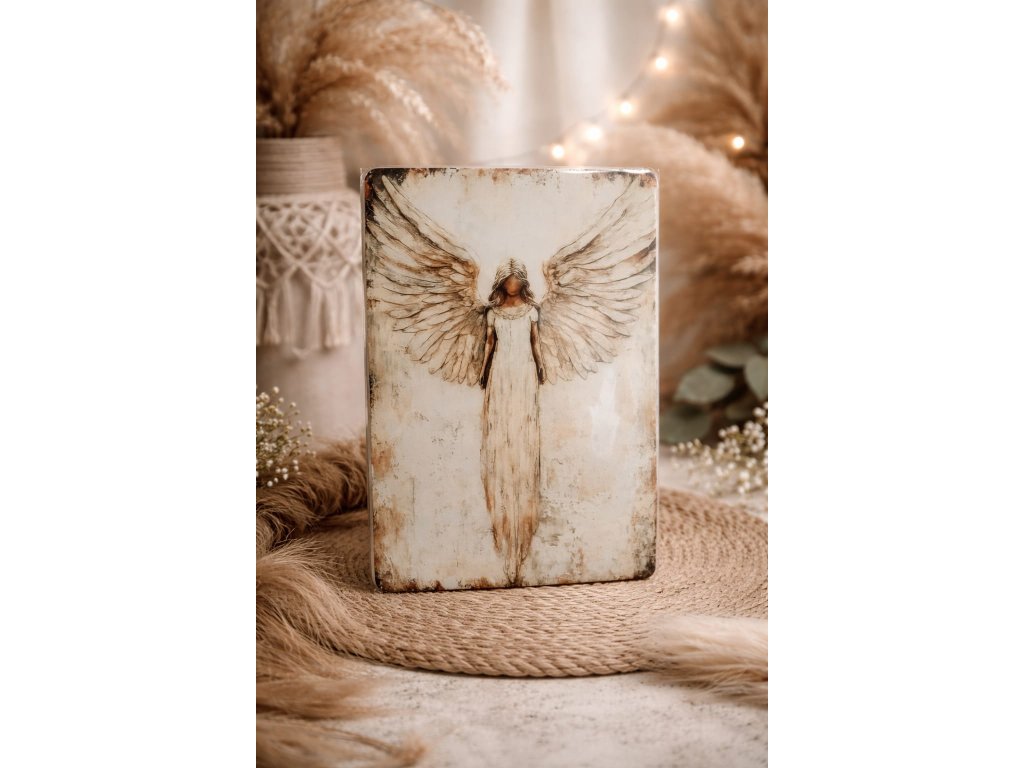 Anděl s roztaženými křídly symbolizuje ochranu, naději a vnitřní sílu. Díky kovovému provedení má obraz pevnou strukturu, dlouhou životnost a lehce lesklý povrch, který dodává celku elegantní vzhled.