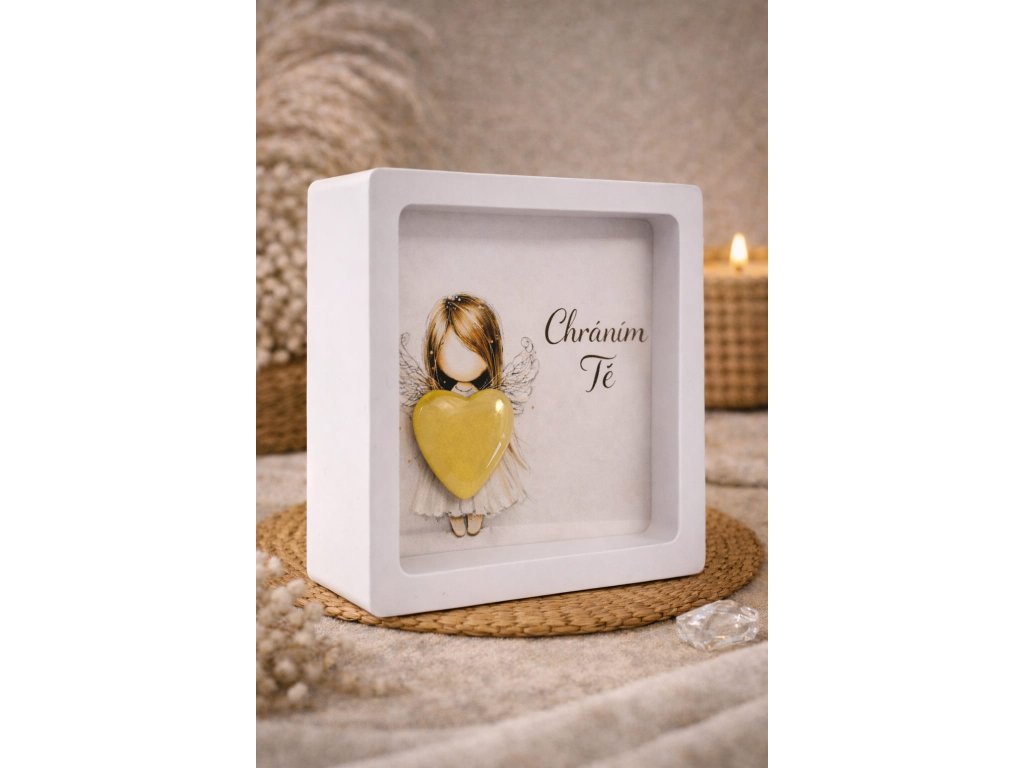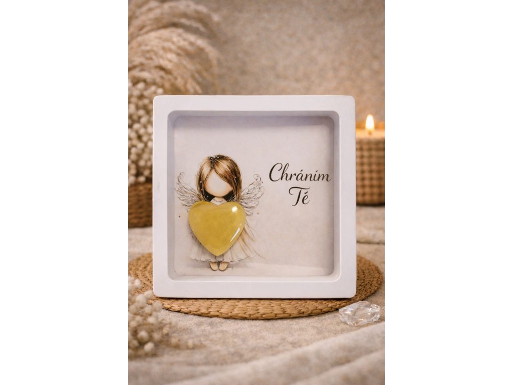 V tomto jemném obraze se snoubí čistota, světlo a hluboký význam. Anděl s něžně rozprostřenými křídly stojí v tichém klidu a ve svých rukou drží srdce – symbol lásky, ochrany a bezpečí. Jeho přítomnost působí jako neviditelná náruč, která objímá, chrání a dává jistotu.