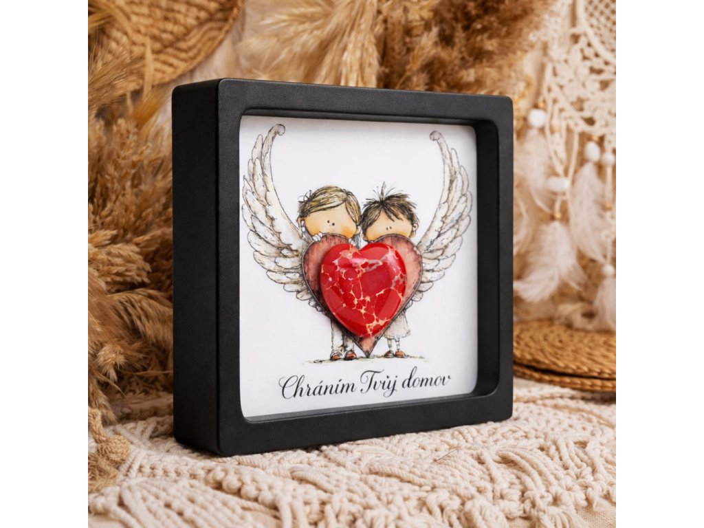 Jemná dekorace s andělským motivem, která přináší do domova pocit klidu, ochrany a lásky. Dva malí andílci drží srdce jako symbol péče o domov a rodinu. Nápis „Chráním Tvůj domov“ připomíná, že domov je místo, kde vládne bezpečí, harmonie a láska.