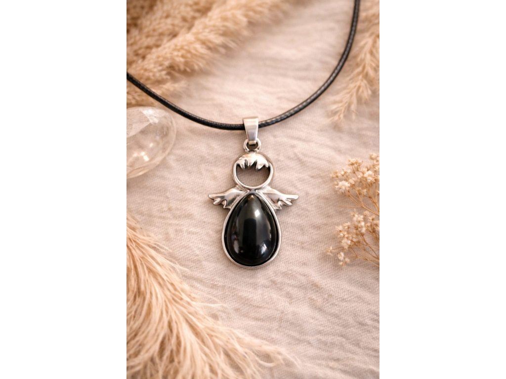 Elegantní andělský přívěsek na černé šňůrce zdobí přírodní kámen Černý onyx v hlubokém lesklém odstínu. Jeho tmavá barva působí silně, ochranně a velmi nadčasově.