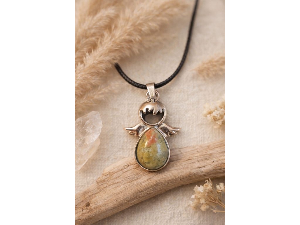 Jemný andělský přívěsek s přírodním kamenem Unakit je symbolem ochrany, harmonie a klidu. Stříbrně tónovaný anděl objímá kapkovitý kámen v nádherných odstínech zelené a jemně růžové barvy.
