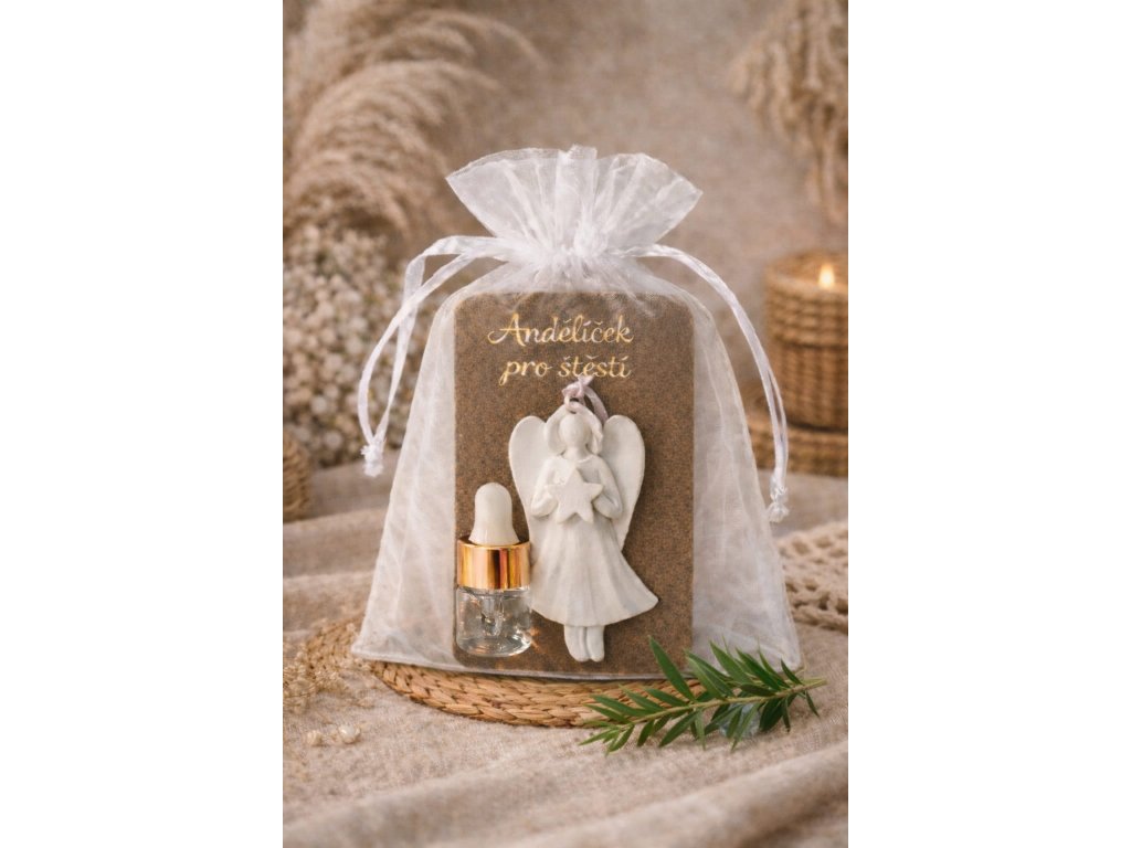 Celý set je umístěn na dárkové kartičce s nápisem „Andělíček pro štěstí“, který podtrhuje jeho symbolický význam. Vše je elegantně zabaleno v jemném bílém organzovém sáčku, který dárku dodává luxusní a slavnostní vzhled.